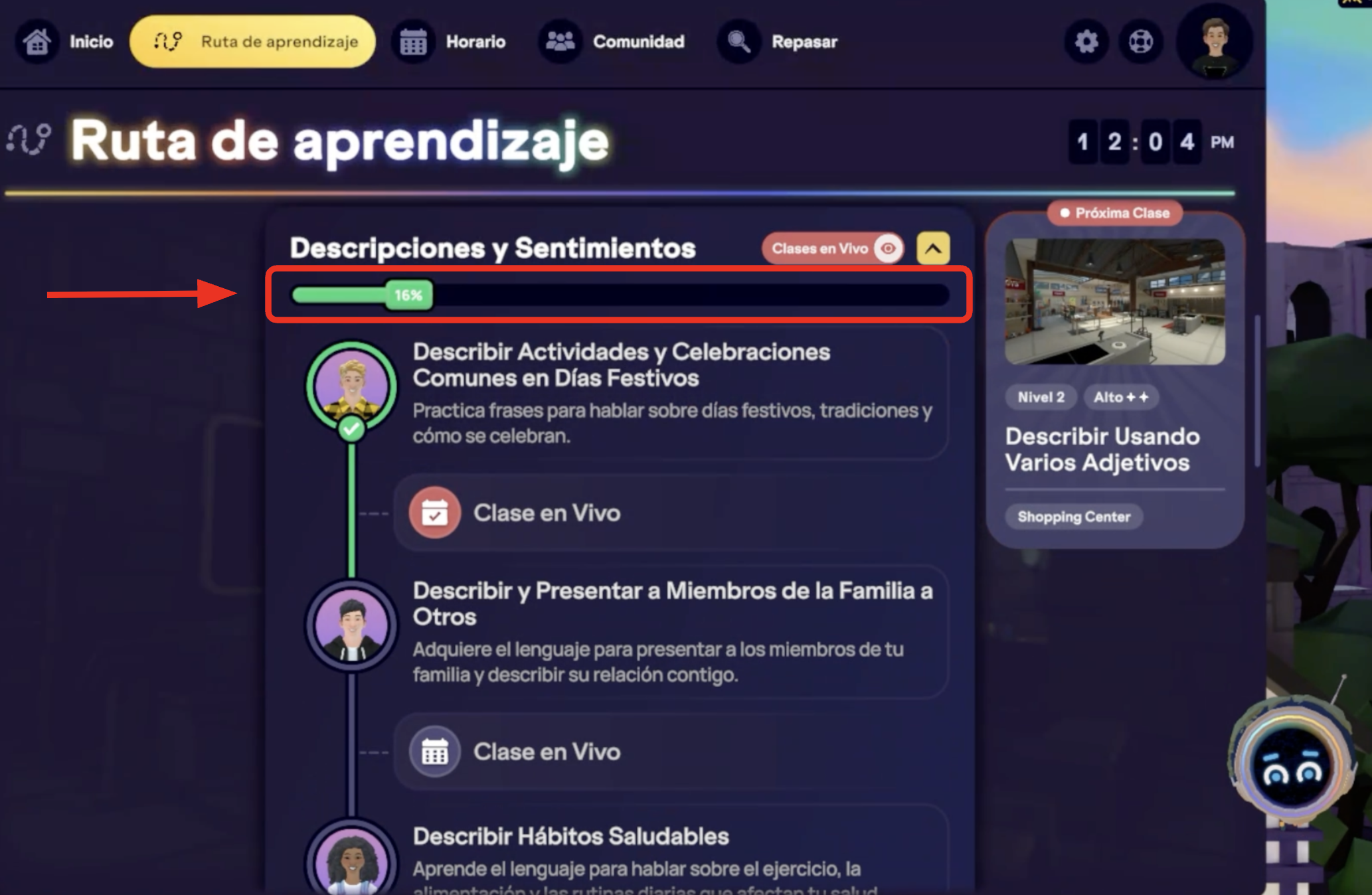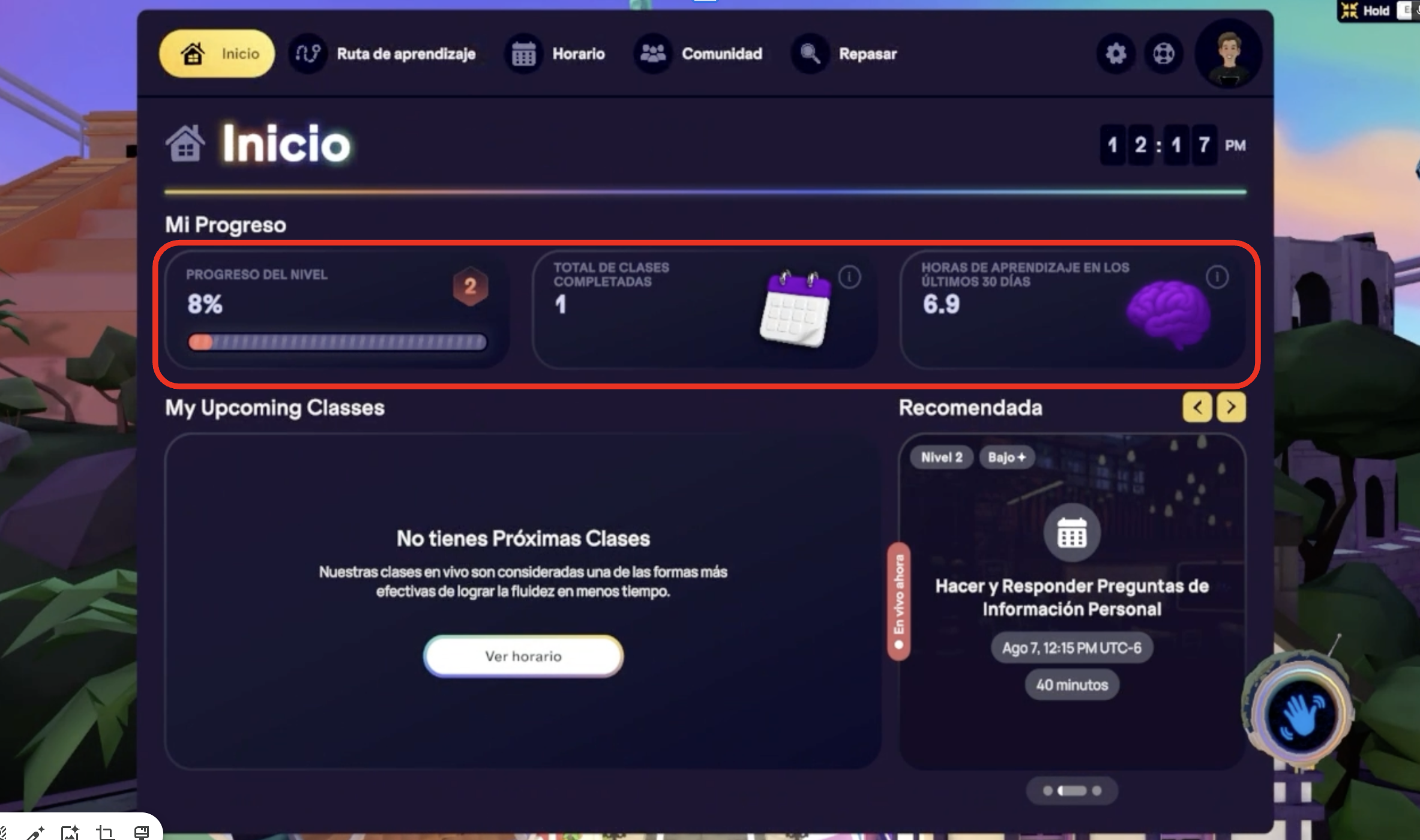 Tu Homeroom te ofrece una mejor visibilidad de tu progreso, separando los diferentes tipos de aprendizaje para que comprendas mejor tus logros. Verás lecciones a tu propio ritmo y clases en vivo individualmente, lo que te dará una visión más precisa y motivadora de tu progreso. ¡Te damos la bienvenida a una nueva forma de seguir tu progreso!