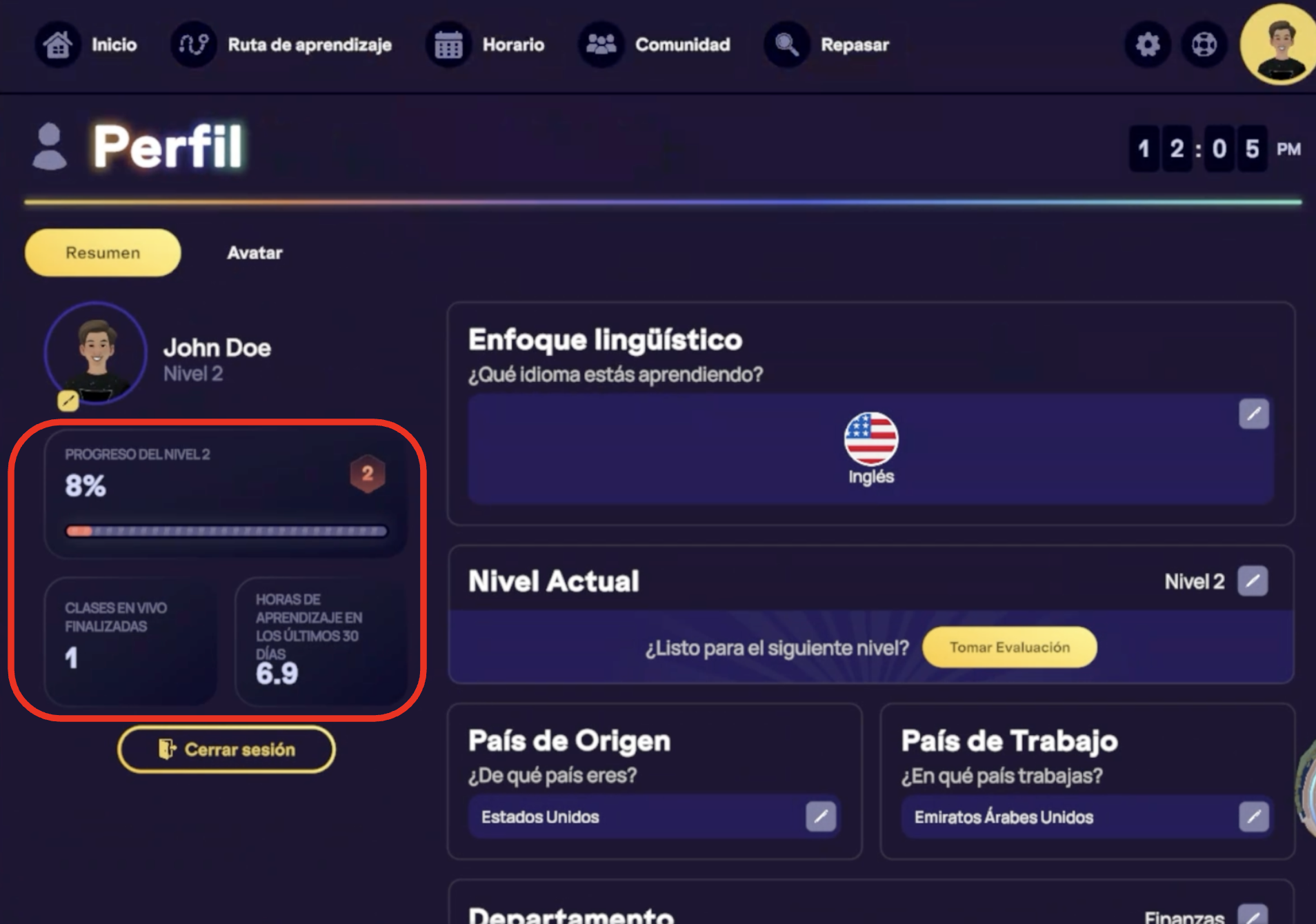 En tu página de inicio, encontrarás métricas específicas que te brindan una visión completa de tu aprendizaje.