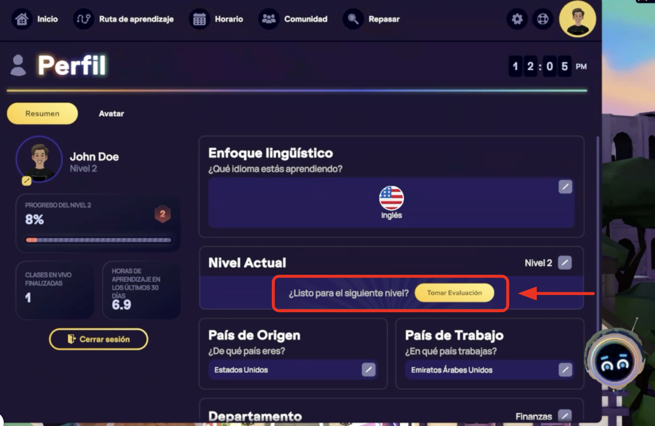 La evaluación de Subida de Nivel se encuentra en tu página de perfil en cualquier momento, pero también se te presentará al final de cada nivel.