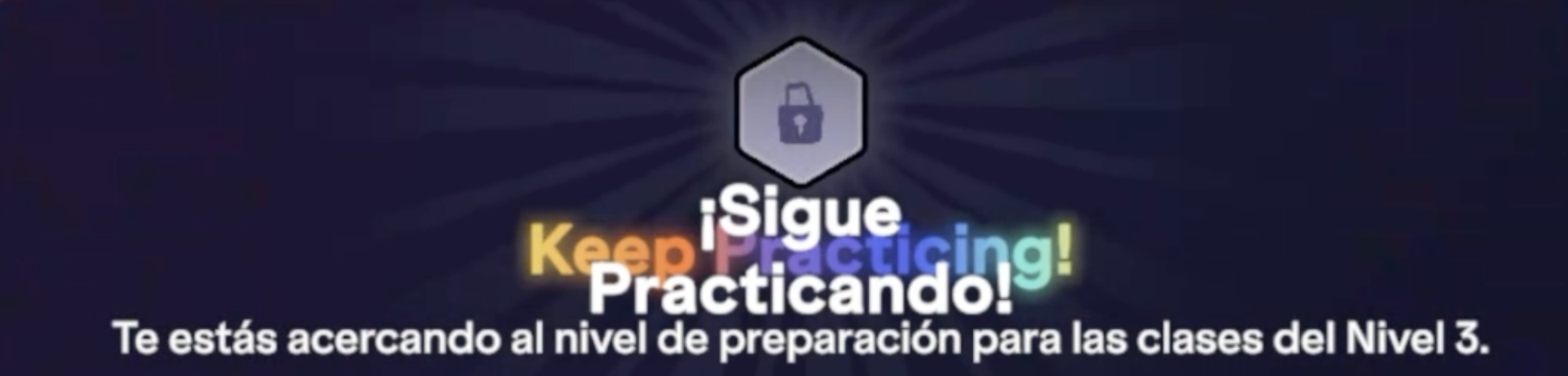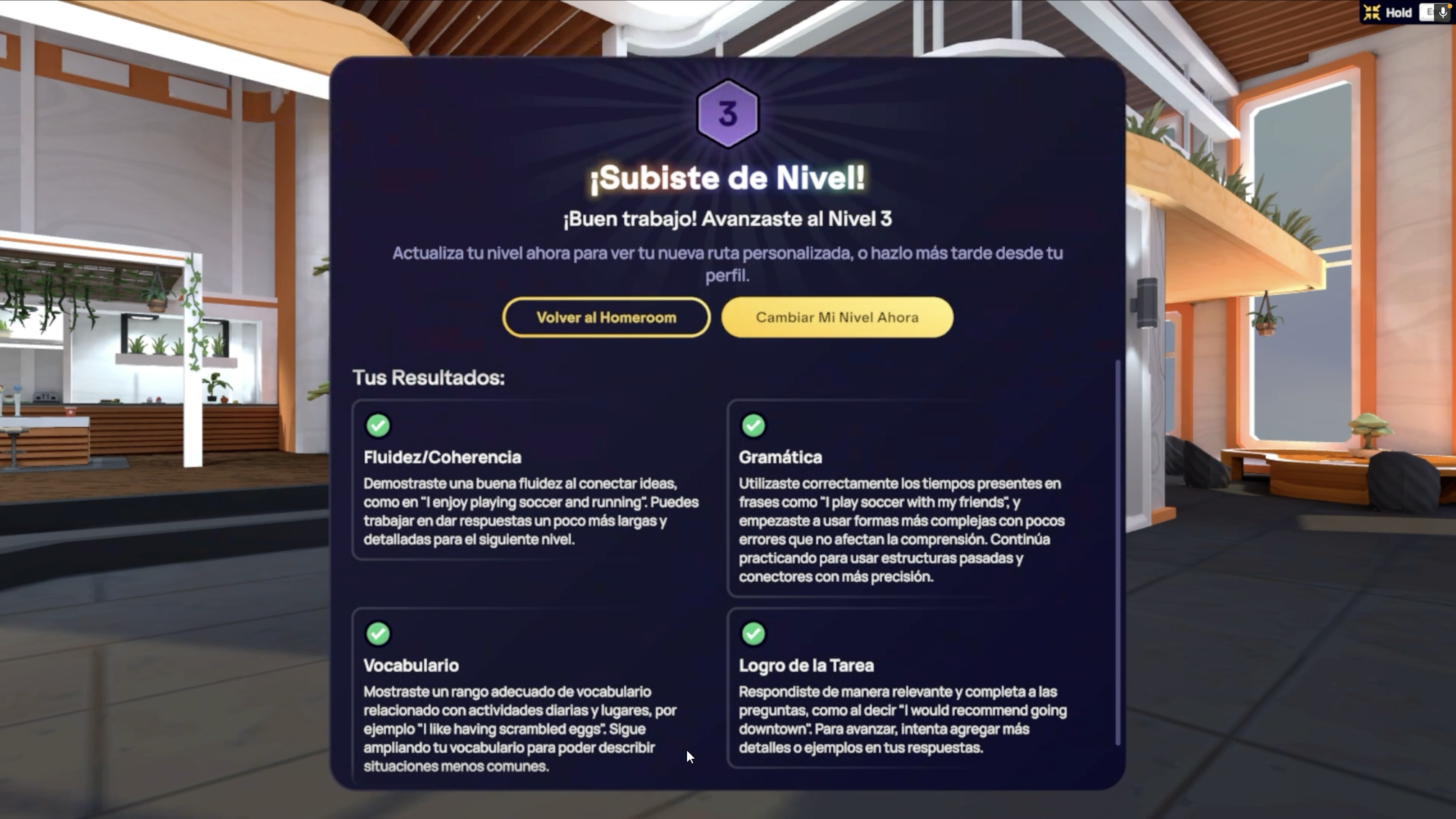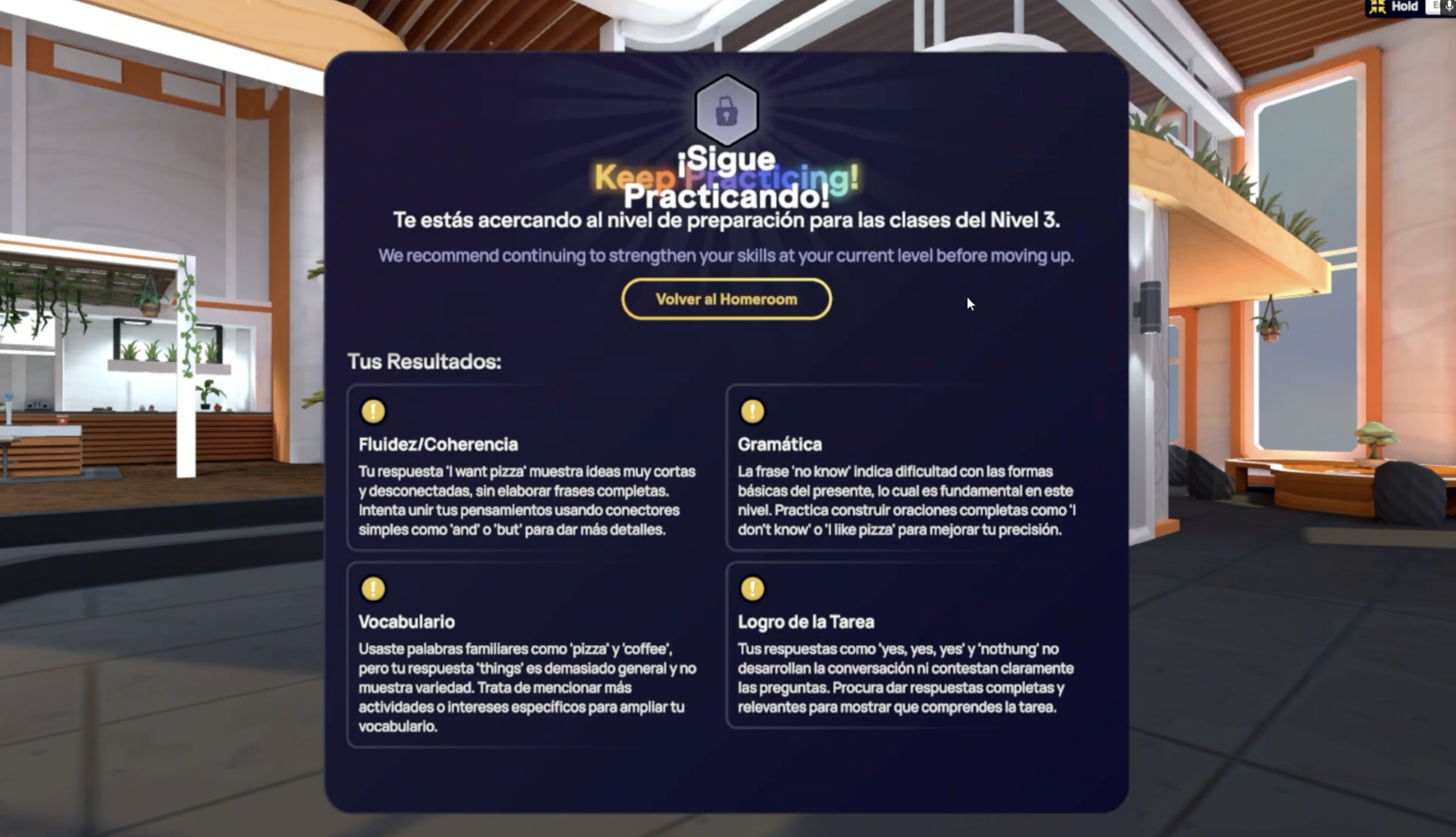 Necesitas más práctica – Si la evaluación determina que aún no estás listo para subir de nivel, recibirás recomendaciones sobre las áreas que puedes mejorar antes de volver a intentarlo. Se te invitará a regresar a tu Homeroom.