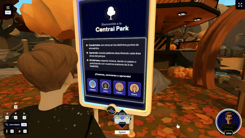 Nuestros avatares de IA ofrecen una experiencia de aprendizaje de idiomas dinámica y personalizada en Escenas Comunitarias, tanto públicas como privadas. Diseñados para fomentar una conversación natural, estos avatares proporcionan un entorno inmersivo para que los usuarios practiquen y perfeccionen tus habilidades lingüísticas.