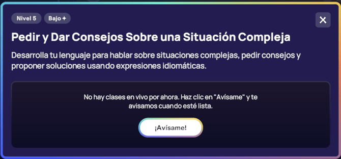 Si la clase en vivo que deseas reservar desde la Ruta de Aprendizaje aún no está programada, puedes optar por recibir una notificación cuando vuelva a estar disponible. Simplemente haz clic en el botón “Avísame”, y te enviaremos un correo electrónico una vez que la reservación esté abierta.