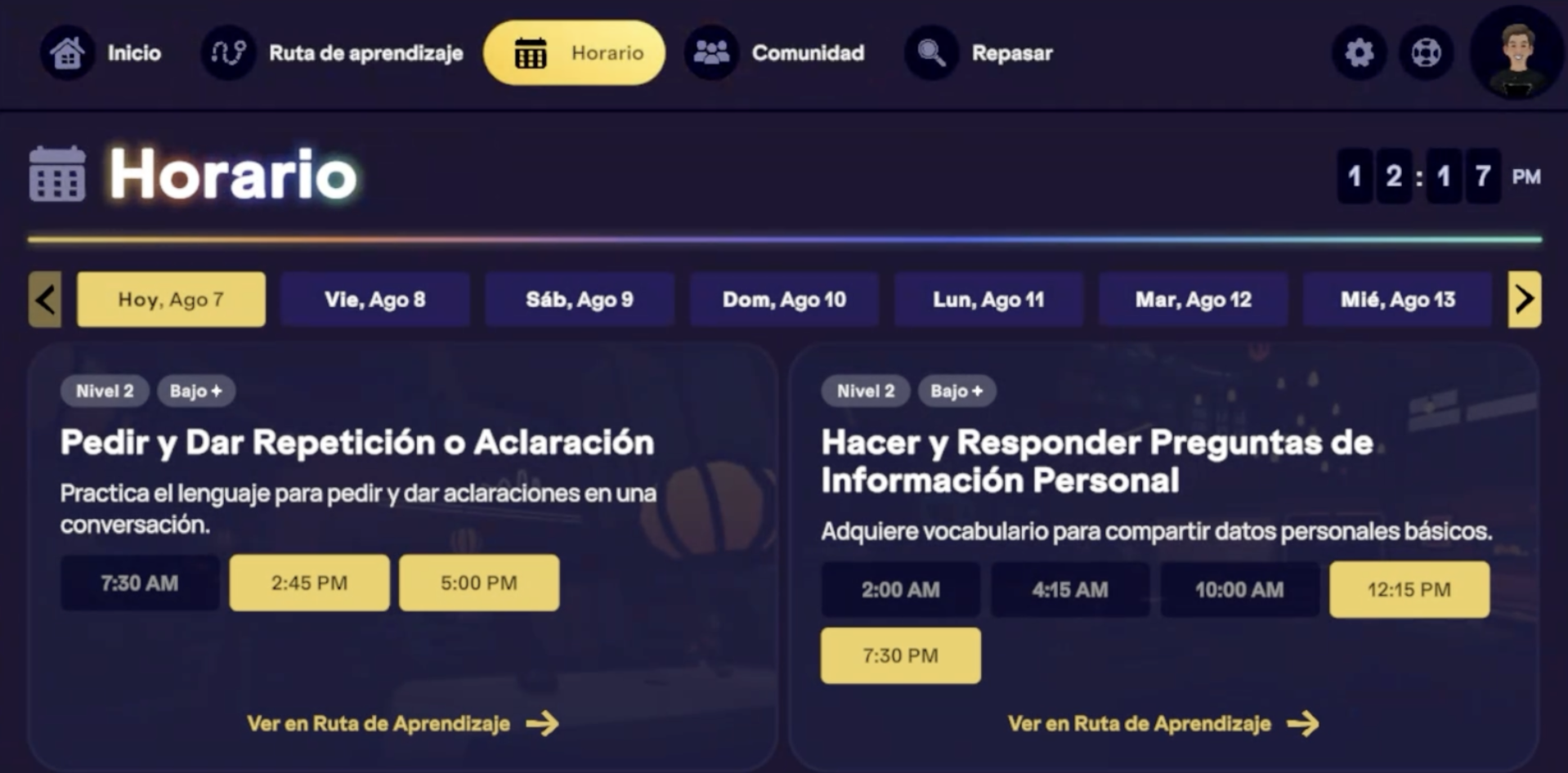 En la pestaña Horario de tu Homeroom, encontrarás clases mostradas de forma no lineal, es decir, no se presentan en el mismo orden que en tu Ruta de Aprendizaje. Esta vista solo muestra las clases relevantes para tu nivel de fluidez actual, y por lo general, verás dos semanas de clases disponibles a la vez.