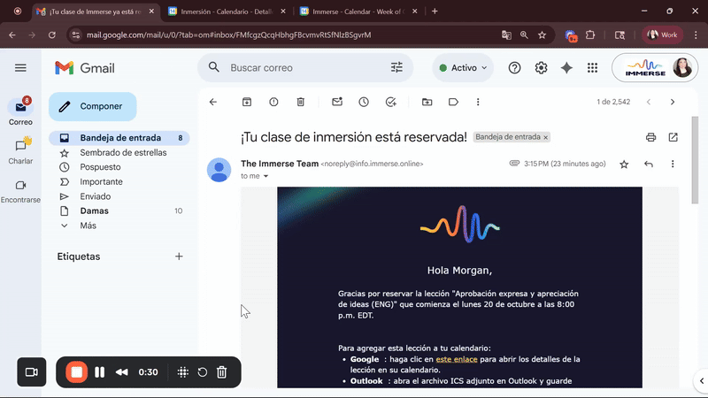 Haz clic en el enlace compartido dentro del correo electrónico de la clase reservada para abrir los detalles de la lección en tu Calendario de Google.