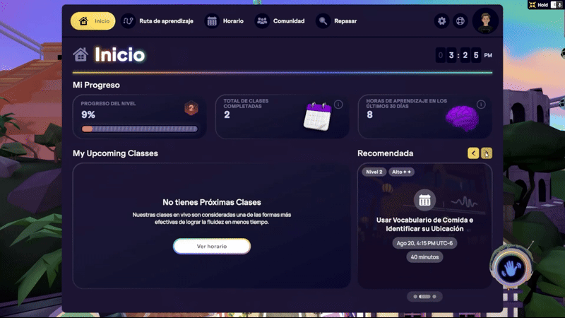 Inicia tu Homeroom de IMMERSE en VR o en la web para visualizar y reservar Clases en Vivo.