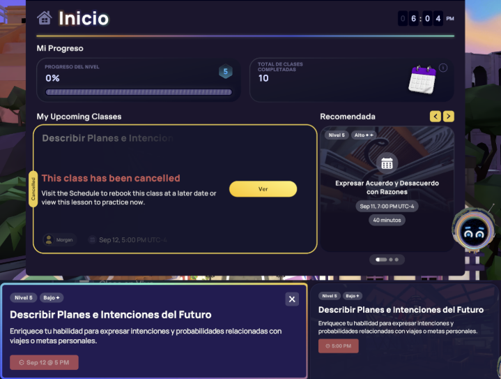 Si cancelamos una clase a la que te inscribiste, ya sea por falta de Guía o por un problema técnico, te enviaremos un correo electrónico y la marcaremos como cancelada en el Homeroom. Asegúrate de que la página se actualice y muestre este estado actualizado; para ello, navega a otra página y regresa, o recarga la aplicación. Haremos todo lo posible por avisarte con la mayor antelación posible y te pedimos disculpas por cualquier inconveniente que una clase cancelada pueda causar a tu aprendizaje. 🩵