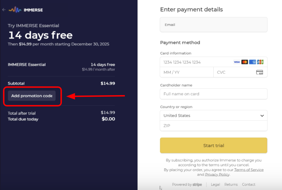 Merci de contacter notre équipe support à support@immerse.com afin que le code soit appliqué à ton compte existant avec un abonnement actif, pour qu’il puisse être utilisé lors du prochain renouvellement de ton abonnement. Les abonnés actifs ne peuvent pas ajouter de codes promotionnels dans les fenêtres de paiement Stripe, sauf s’ils changent de formule.