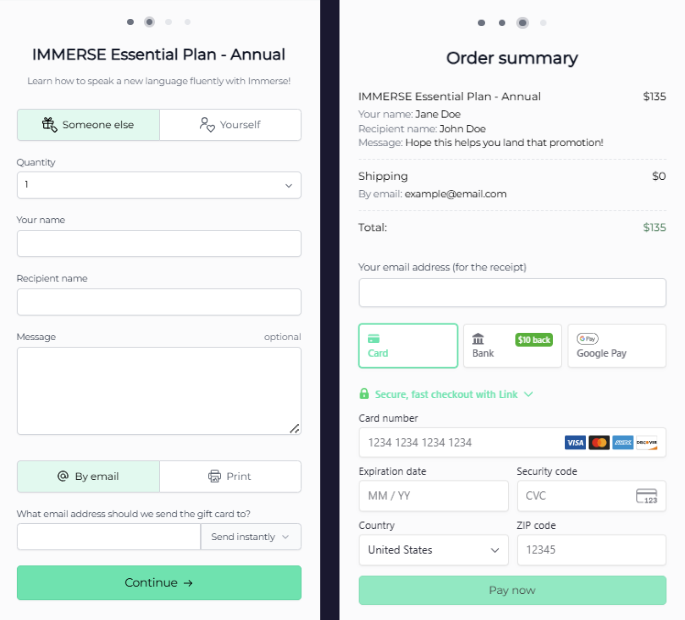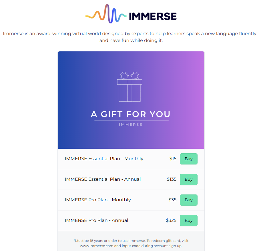 IMMERSE t’offre une façon pratique et attentionnée d’offrir le cadeau de l’apprentissage des langues grâce à l’achat d’une carte cadeau numérique. Ces cartes cadeaux sont un présent idéal pour une occasion spéciale, comme un anniversaire, les fêtes, une remise de diplôme, ou simplement comme un geste d’encouragement pour toute personne intéressée à rejoindre la communauté d’apprentissage des langues en réalité virtuelle d’IMMERSE.