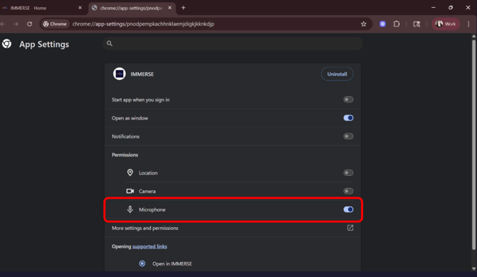 La première fois que tu lances l’application IMMERSE dans le navigateur, il te sera demandé d’autoriser l’accès au microphone et au presse-papier. Assure-toi de cliquer sur le bouton Autoriser.