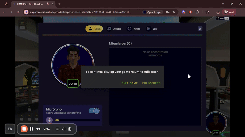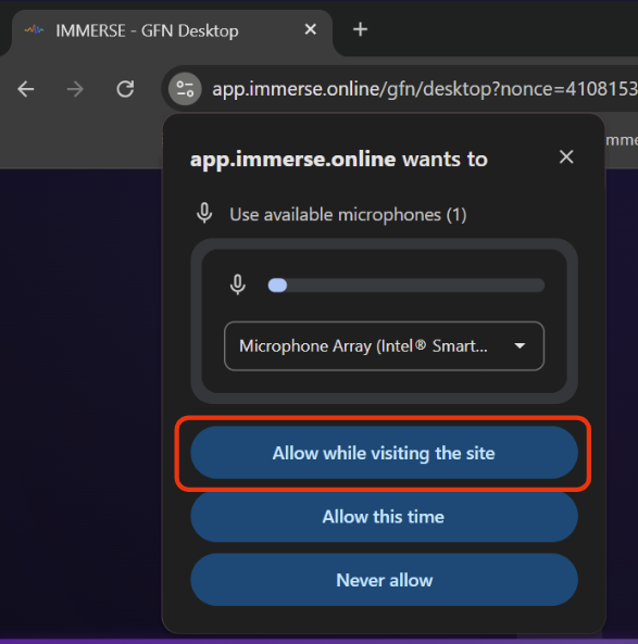1. Accorder l’accès: Vérifie que le navigateur de ton ordinateur et le domaine app.immerse.online sont autorisés à utiliser ton microphone.