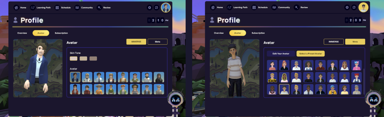 Les apprenants sans accès à un casque VR peuvent choisir parmi les 16 avatars classiques IMMERSE ou parmi une sélection de 32 avatars Meta prédéfinis, plus détaillés et de meilleure qualité.