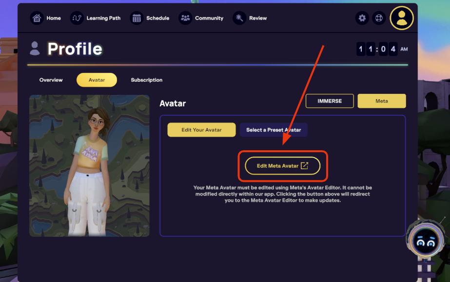 Clique > Modifier l’avatar Meta pour ouvrir la fenêtre de modification de l’avatar dans un nouvel onglet, en dehors d’IMMERSE.