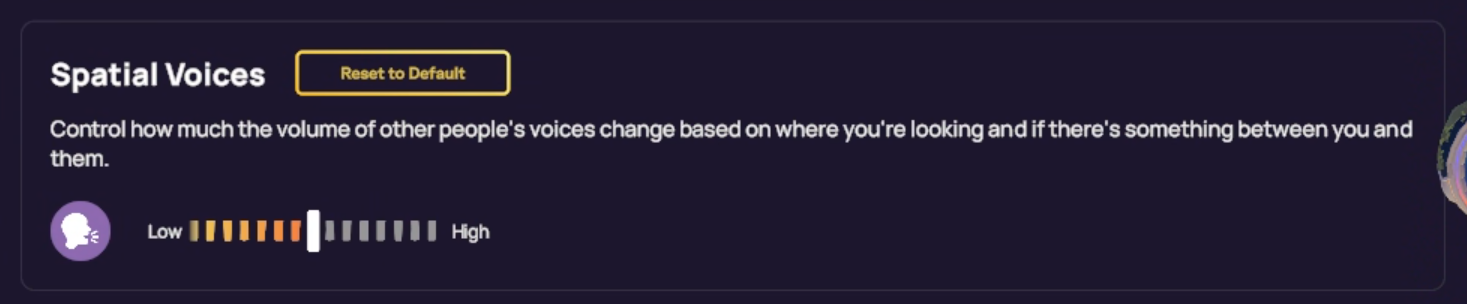 Ensemble, les réglages ci-dessous aident à créer une expérience audio plus claire et plus focalisée en VR en donnant la priorité à ta voix par rapport aux autres sons.