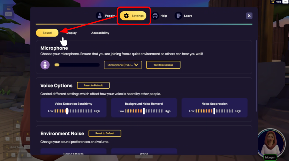 Tu éprouves des difficultés à entendre les autres utilisateurs même lorsque ton volume est au maximum ? Tu as du mal à entendre les sons environnementaux comme le chant des oiseaux ou le crépitement d’un feu dans certaines scènes ? Ou peut-être que la musique de fond te distrait ? Ne t’inquiète pas ! Tu peux ajuster plusieurs paramètres audio pour personnaliser ton expérience IMMERSE et profiter au maximum.