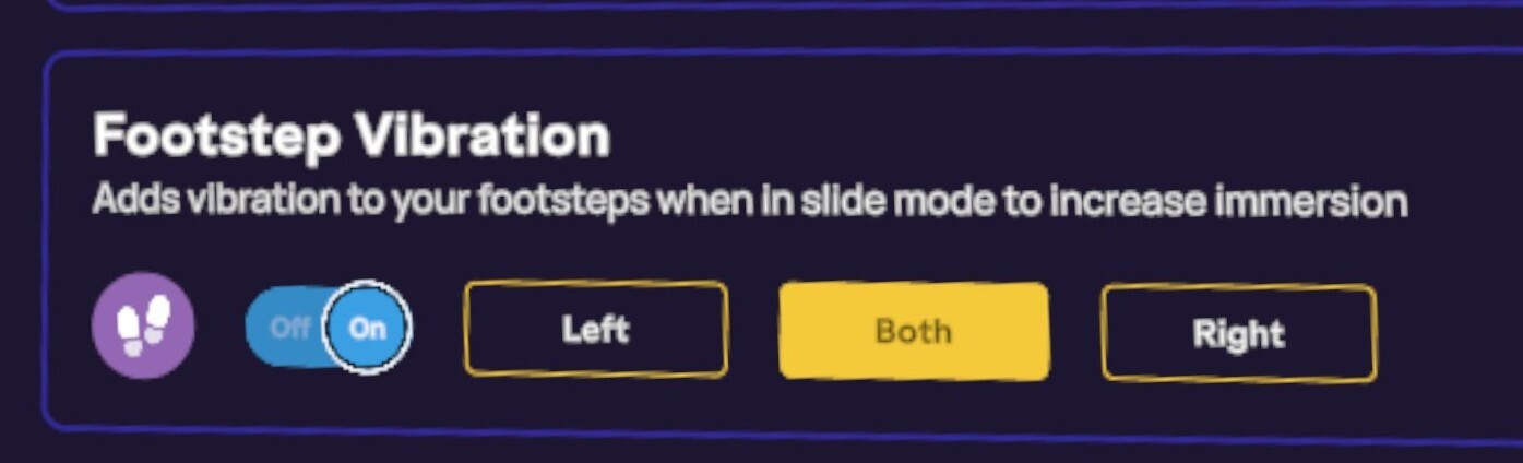 En mode glisse, activez ce paramètre pour une expérience immersive renforcée grâce au retour haptique. Cette fonctionnalité ajoute des vibrations à vos pas, transmises par vos manettes. Vous pouvez choisir de ressentir le retour dans les deux pieds ou de privilégier un côté plutôt que l'autre.