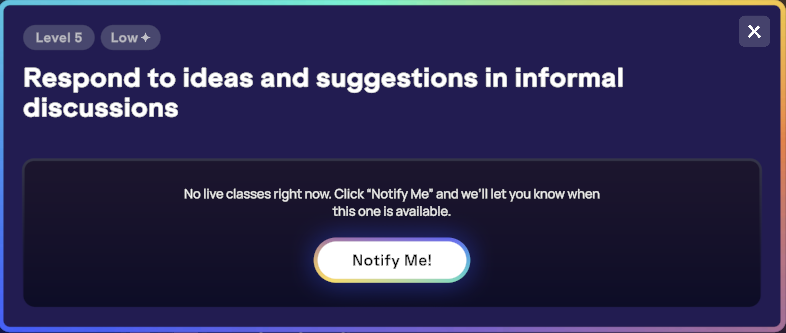 Si le cours en direct que tu souhaites réserver depuis le parcours d’apprentissage n’est pas encore programmé, tu peux choisir d’être informé lorsqu’il sera de nouveau disponible. Il te suffit de cliquer sur le bouton « Me notifier », et nous t’enverrons un e-mail dès que les réservations seront ouvertes.