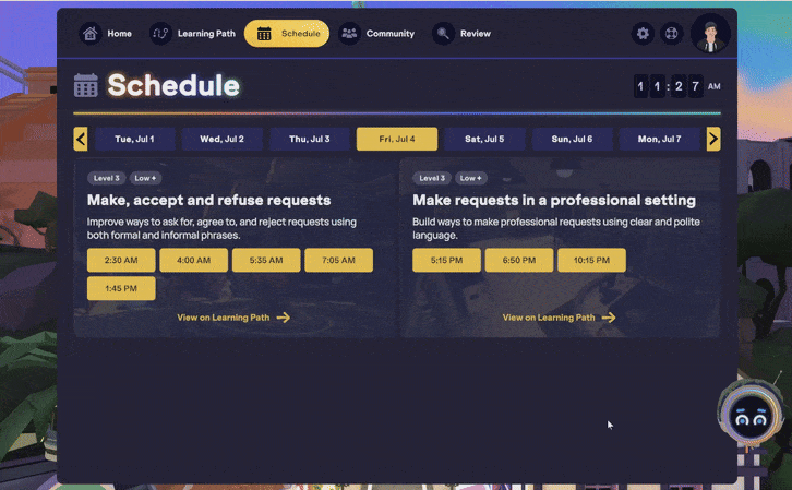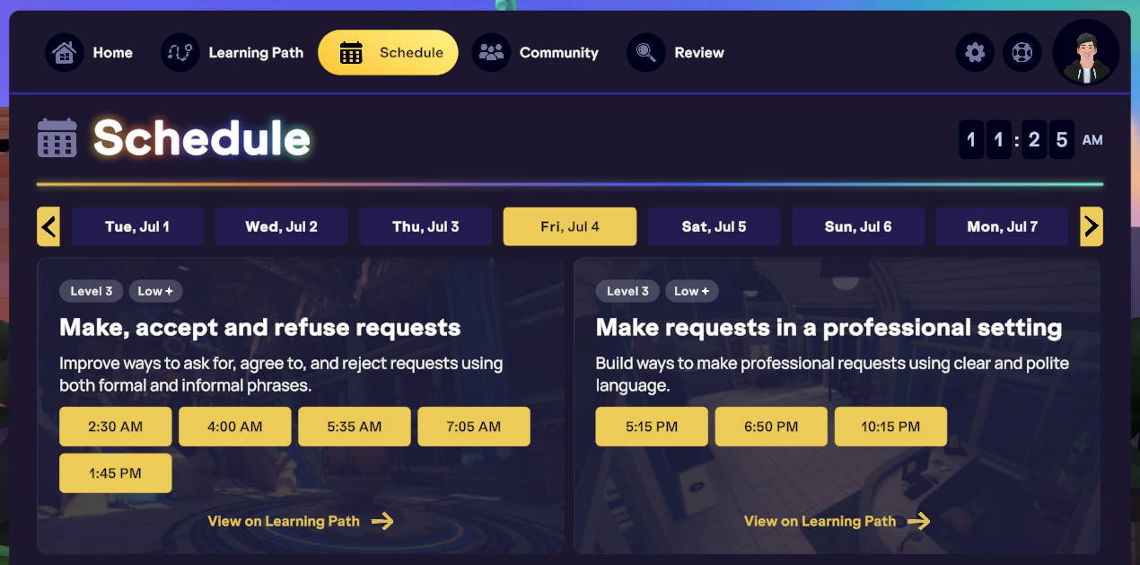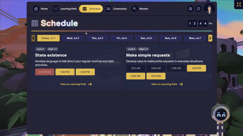 Dans l’onglet Planning de ton Homeroom, les cours sont affichés de manière non linéaire, ce qui signifie qu’ils ne sont pas présentés dans le même ordre que ton parcours d’apprentissage. Cette vue affiche uniquement les cours correspondant à ton niveau de fluidité actuel, et tu verras généralement deux semaines de cours disponibles à la fois.