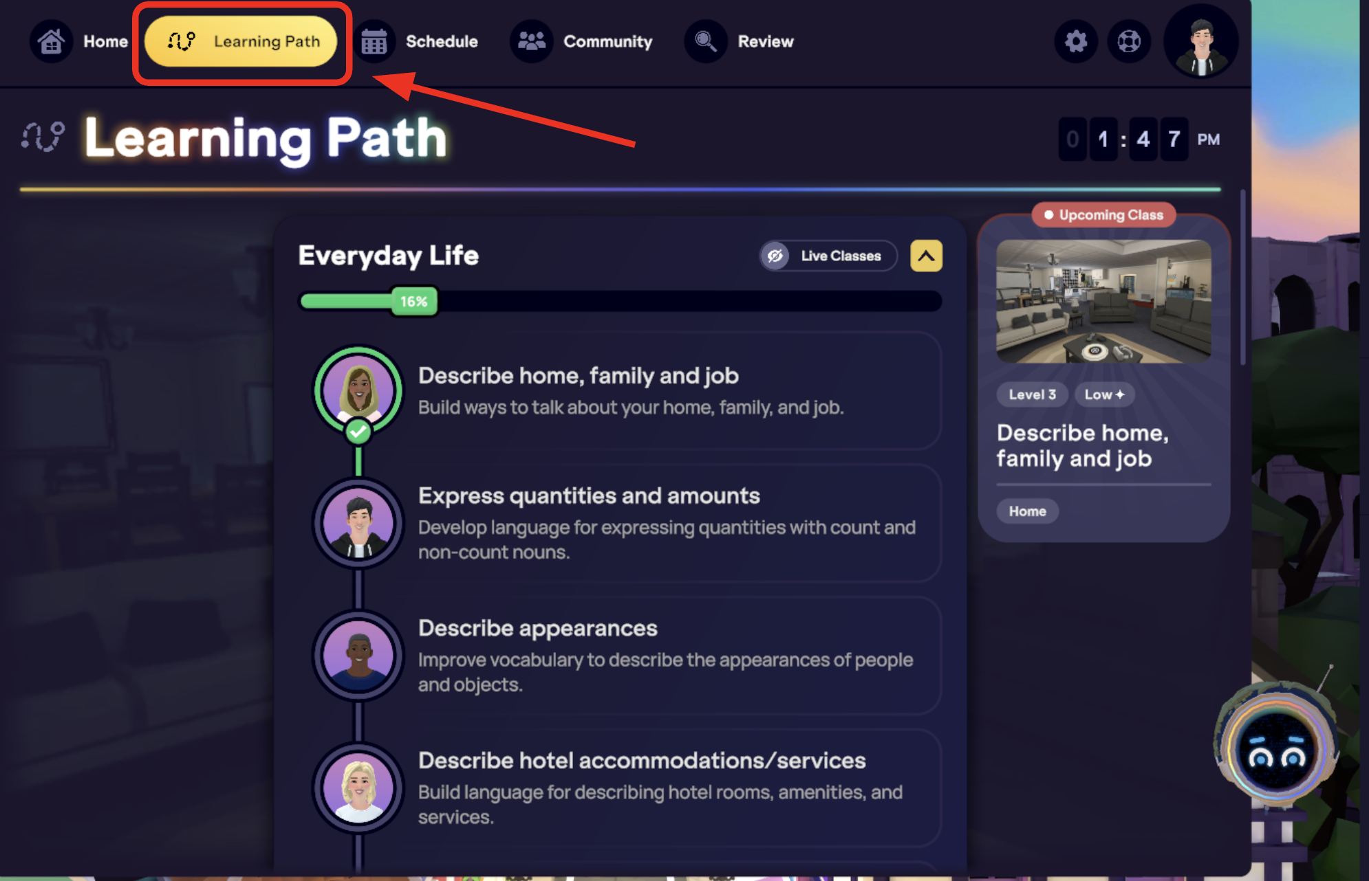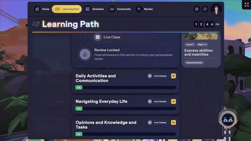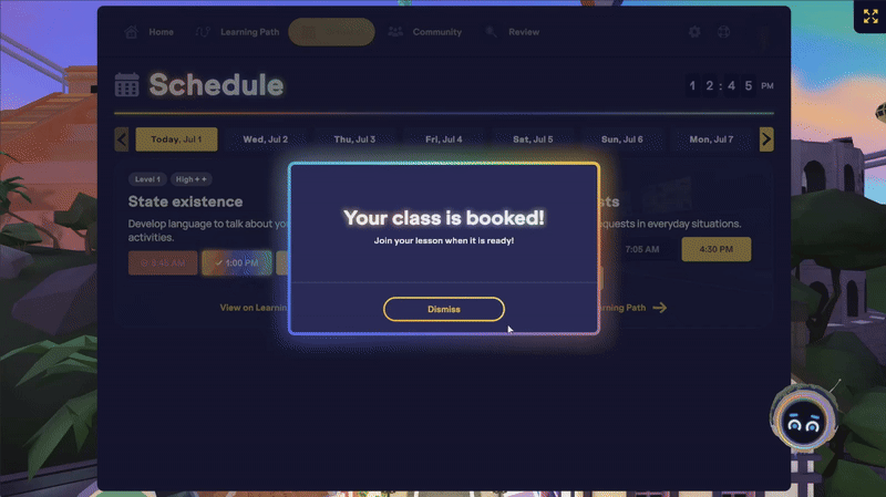 ⚙️ Remarque: tu peux réserver et suivre des cours en direct avant d’avoir terminé la leçon en autonomie associée dans le parcours d’apprentissage. Même si le cours en direct sera marqué comme terminé, tu devras tout de même finir la leçon en autonomie pour valider ta progression de niveau et recevoir le récapitulatif de feedback de la leçon.