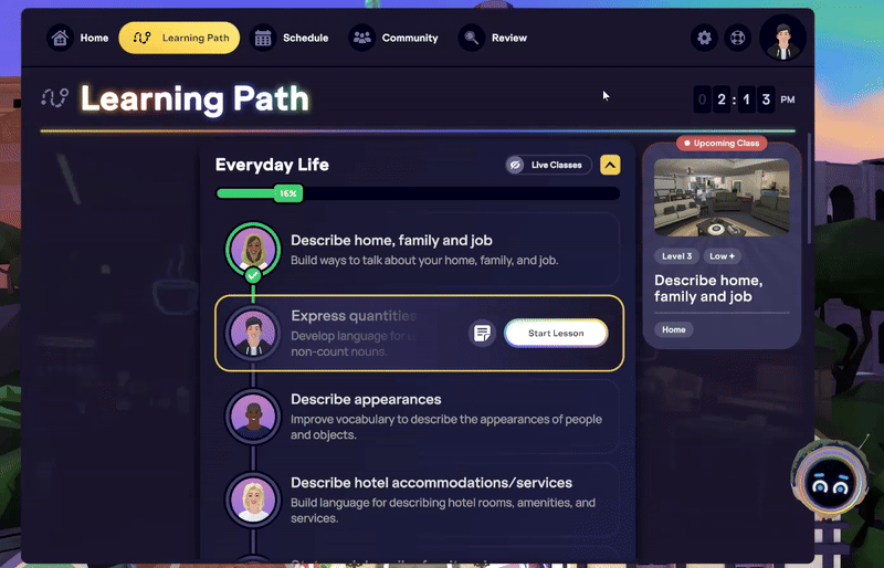 Les cours en direct IMMERSE sont dynamiques et engageants, accélérant ton parcours vers la fluidité grâce à une interaction active et un accompagnement en temps réel par des Guides experts. Ces instructeurs passionnés créent des environnements d’apprentissage agréables avec des activités interactives, des discussions animées et des exercices pratiques, transformant les concepts complexes en leçons mémorables. Ils offrent des retours personnalisés et construisent une communauté d’apprenants bienveillante.