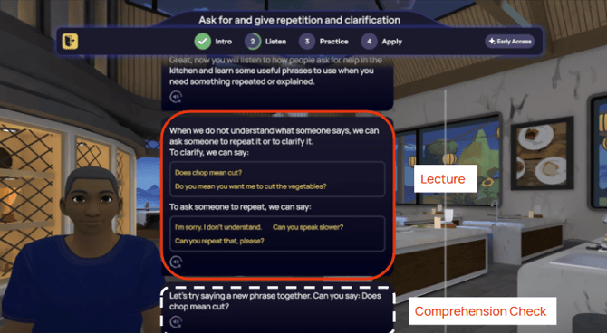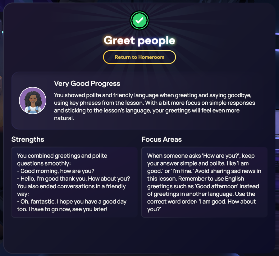 Chaque leçon commence par la démonstration de nouveaux concepts au travers de conversations réalistes avec un avatar, puis est décomposée par des instructions guidées et des exercices pratiques. Pour terminer le module, vous appliquerez vos nouvelles connaissances dans un jeu de rôle avec un avatar, et recevrez un feedback instantané, piloté par l'IA, parfaitement adapté à l'objectif de communication de la leçon. Ce processus vous permet de revoir et de pratiquer la matière aussi souvent que nécessaire pour atteindre la maîtrise.