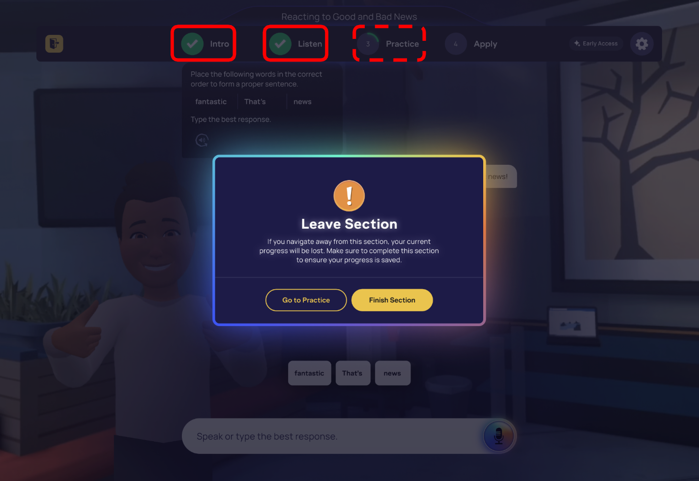 Malheureusement, les versions précédentes de ces activités ne sont plus prises en charge. Cependant, les versions actuelles sont conçues pour faciliter votre apprentissage de la langue. Elles vous encouragent à produire la langue par vous-même plutôt que de vous fier à une liste d'options. En supprimant l'option de saisie de réponse, ces parties des leçons évalueront véritablement votre aisance à l'oral, vous permettant ainsi de gagner en confiance une fois que vous aurez obtenu le feu vert pour progresser !