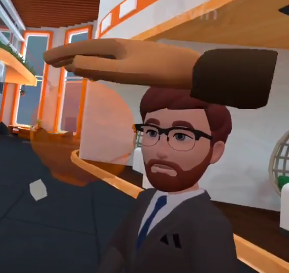 Vous pourrez voir un hologramme des menus Geo d'autres utilisateurs (VR uniquement) flottant (voir la photo ci-dessous). Vous pourrez parfois entendre Geo dans leur micro si leur appareil le capte, mais sinon, ils ne l'entendront pas directement depuis IMMERSE. Les utilisateurs peuvent couper le son des autres ou de leur propre micro s'ils ne souhaitent pas entendre le retour du micro.