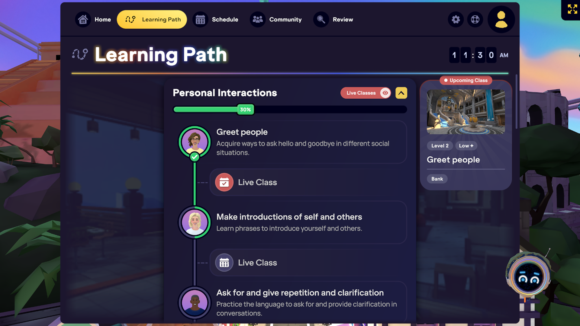 • Maintenant : un chemin linéaire vous guide à travers des leçons thématiques à votre rythme et des cours en direct associés, vous aidant à suivre facilement vos progrès.
