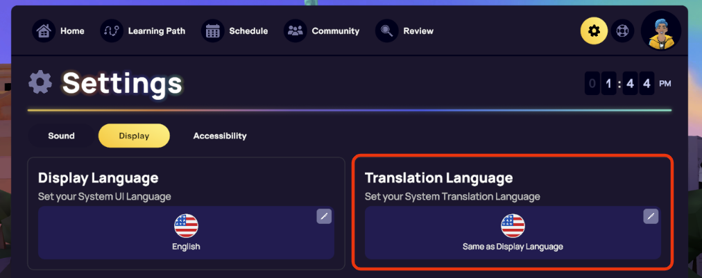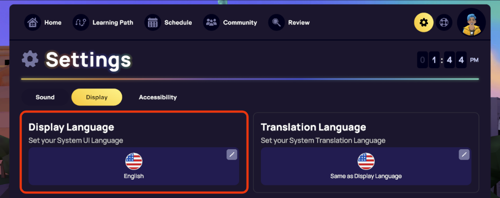 Après vous être connecté à l'application web IMMERSE ou à la salle de classe IMMERSE, vous pouvez modifier la langue d'affichage à plusieurs endroits, y compris pendant un cours en direct ou une scène communautaire ! 🎉