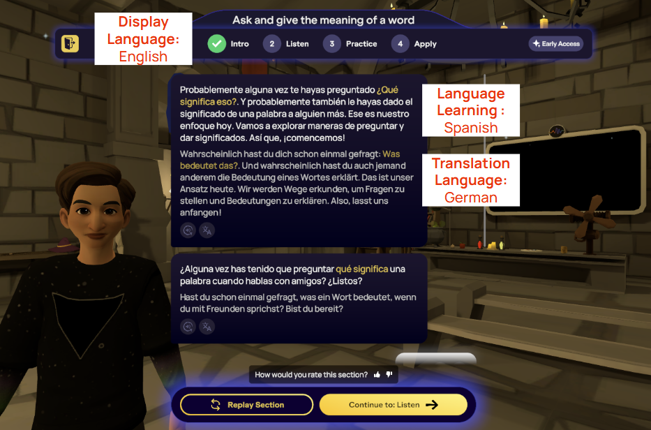 La langue de traduction du système détermine la langue de sortie de toutes les traductions dynamiques ou générées par l'IA qui s'affichent dans l'application IMMERSE. Cela inclut les traductions textuelles et les réponses générées par l'IA dans les leçons à rythme libre, ainsi que les résultats de la fonctionnalité d'assistance linguistique. L'intégration d'API d'IA générative tierces nous permet de prendre en charge davantage de langues dans ces outils que celles disponibles via nos options d'affichage standard.