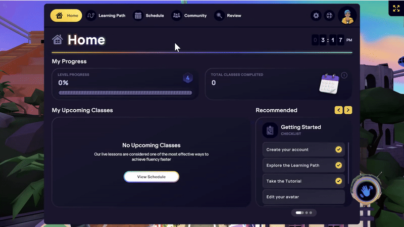 Actuellement, vous ne pouvez modifier votre langue de traduction par défaut qu'après vous être connecté à la salle de classe IMMERSE. Vous pouvez le faire depuis un ordinateur ou en réalité virtuelle. Une fois connecté, vous pouvez modifier la langue dans la salle de classe, pendant un cours en direct ou une scène communautaire.