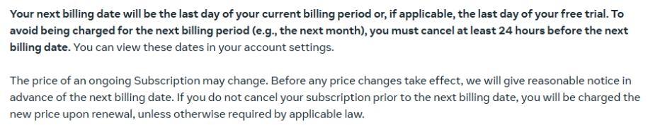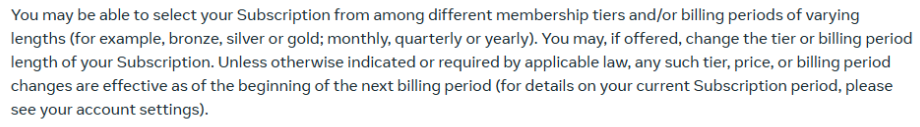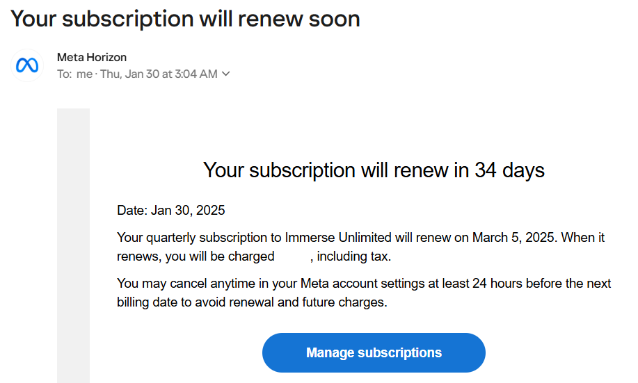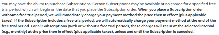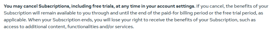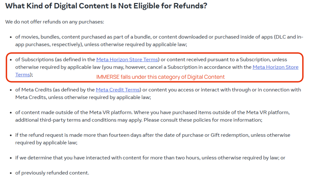 Meta gère sa propre facturation d’abonnements, donc ses politiques peuvent différer de celles d’IMMERSE. On te conseille de revoir les points clés détaillés ci-dessous. Toutes les images et tous les textes sont tirés directement des Conditions de vente du Meta Horizon Store.