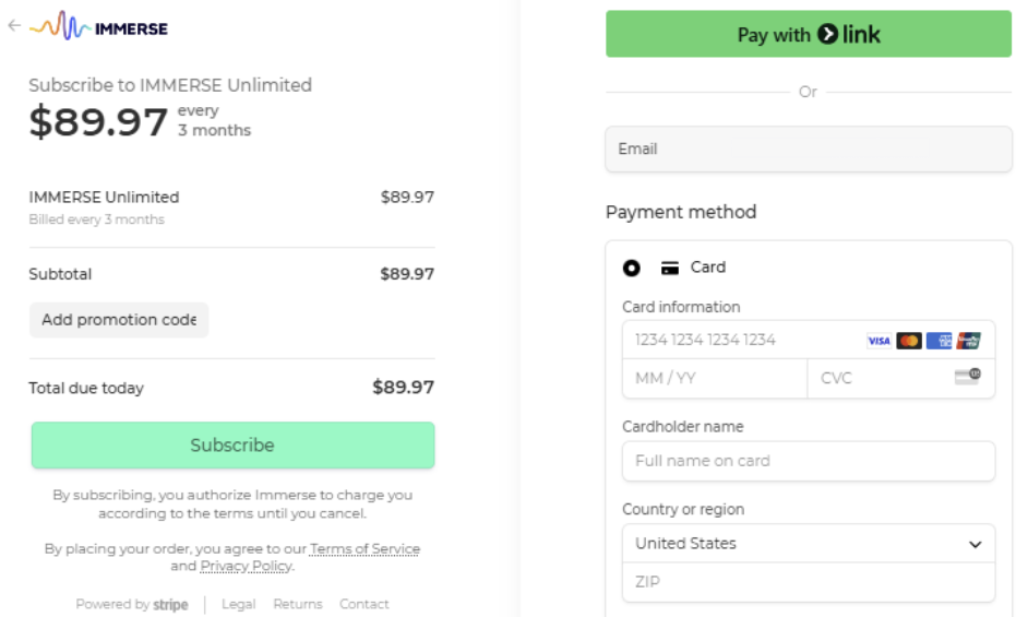 IMMERSE gère la facturation des abonnements web via Stripe. Comme indiqué dans nos Conditions d’utilisation et sur toutes les factures et reçus, Immerse n’accorde pas de remboursements pour les frais d’abonnement.