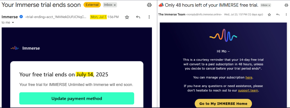 IMMERSE envoie des emails concernant la fin des essais et les renouvellements d’abonnement sept jours avant, puis à nouveau 48 heures avant, que des frais soient appliqués à ton compte. Cela te laisse le temps de gérer ton abonnement ou de contacter notre équipe support avant d’être facturé. Les reçus sont envoyés par email après les débits. Tu recevras aussi des emails de confirmation pour tout changement ou annulation de tes forfaits. Si tu ne reçois pas ces emails, merci de contacter le support.