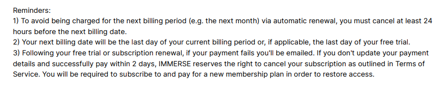 Ton abonnement au plan IMMERSE active ton cycle de facturation à la date et à l’heure exactes de ton inscription. Les frais de renouvellement seront appliqués mensuellement, trimestriellement (tous les trois mois) ou semestriellement (tous les six mois) le jour correspondant du mois.