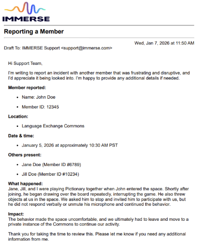 Chez IMMERSE, nous nous engageons à favoriser un environnement accueillant et respectueux pour tout le monde. En tant que membres de cette communauté, nous partageons tous la responsabilité de faire respecter ces valeurs. Si tu es témoin d’un comportement qui ne correspond pas à nos Règles de la communauté, le signaler nous aide à maintenir un espace positif pour l’apprentissage et la connexion.