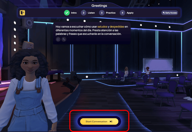 「リスニング」ステージは、2人のアバターによる会話から始まります。この会話は、レッスンの目標に関連した日常的なシチュエーションに基づいて作られており、実際の会話で使われる自然な表現が使われています。