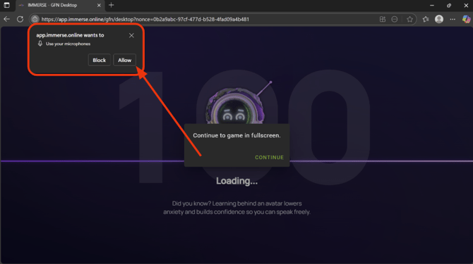 Na primeira vez que você iniciar o aplicativo IMMERSE no navegador, será solicitado que você conceda acesso ao microfone e à área de transferência do navegador. Certifique-se de clicar no botão "Permitir" .