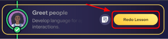 Para reiniciar a Lição de IA Autoguiada e buscar um melhor desempenho e feedback, passe o cursor sobre o bloco correspondente e selecione Refazer Lição .