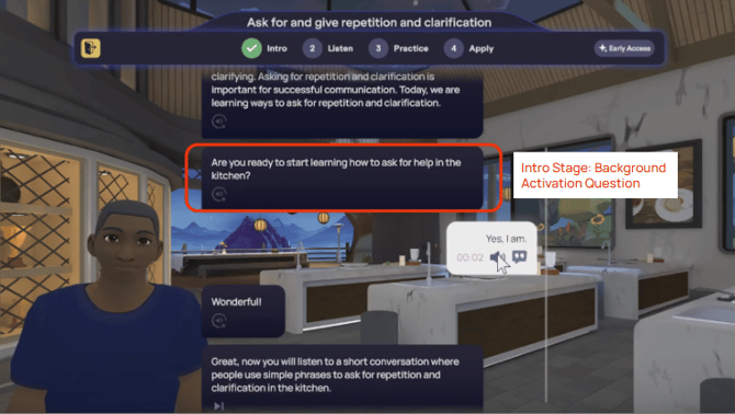 Cada lição começa demonstrando novos conceitos por meio de conversas realistas com avatares, que são então detalhadas com instruções guiadas e prática. Para concluir o módulo, você aplicará seu novo conhecimento em um cenário de dramatização com um avatar, recebendo feedback instantâneo, gerado por IA, que está precisamente alinhado com o objetivo comunicativo da lição. Todo esse processo permite que você revise e pratique o material quantas vezes forem necessárias para alcançar a maestria.