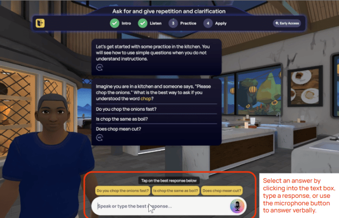 As lições autoguiadas são pré-programadas com um avatar e um cenário específicos para complementar o conteúdo da lição, e os alunos não podem alterar essas configurações. Para praticar em diferentes espaços com o avatar de sua escolha, explore nossos Cenários da Comunidade .