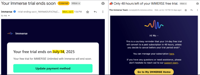 A IMMERSE envia e-mails sobre o término do período de teste e a renovação da assinatura sete dias antes e novamente 48 horas antes da cobrança ser efetuada em sua conta. Isso lhe dá tempo suficiente para gerenciar sua assinatura ou entrar em contato com nossa equipe de suporte antes da cobrança. Os recibos são enviados por e-mail após a cobrança. Você também receberá e-mails de confirmação para quaisquer alterações ou cancelamentos feitos em seus planos. Caso não esteja recebendo esses e-mails, entre em contato com o suporte.