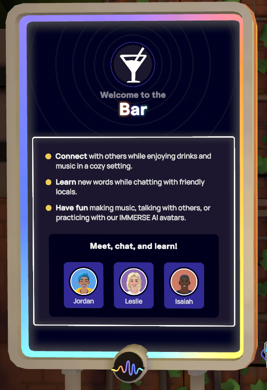 Os Espaços Comunitários são locais abertos e exclusivos para praticar o que você está aprendendo na IMMERSE fora da sala de aula, seja com avatares de IA ou outros membros reais! Os Espaços Comunitários estão disponíveis 24 horas por dia, 7 dias por semana, e não é necessário agendar. Basta entrar e praticar quando quiser. Eles oferecem privacidade flexível para explorar sozinho ou com amigos em uma sala privada, ou conhecer novas pessoas em espaços públicos!
