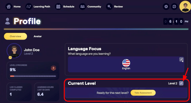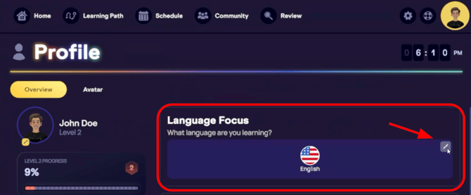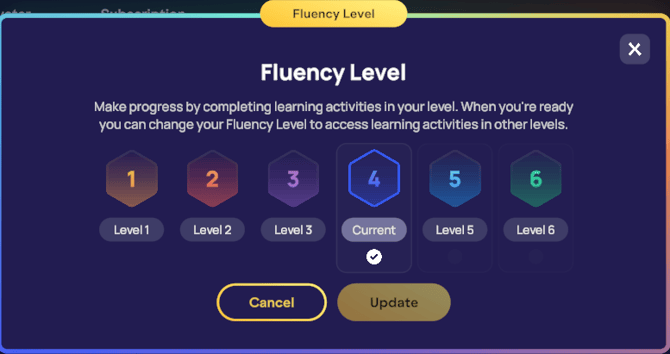 Você pode alterar seu nível de fluência a qualquer momento seguindo as etapas abaixo. Isso permite que você explore lições e atividades que melhor correspondam às suas habilidades e objetivos atuais.