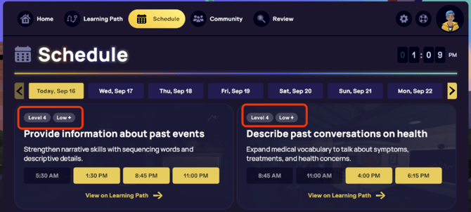 Independentemente do nível escolhido, todas as aulas agendadas são listadas na seção " Minhas Próximas Aulas " na Página Inicial. Os usuários podem acessar materiais de preparação para qualquer aula agendada aqui, sem precisar alterar a configuração do nível da conta.