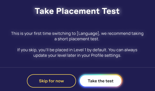 Quando você muda o foco do seu idioma pela primeira vez, será solicitado que você conclua outro Teste de Nivelamento para avaliar sua fluência no novo idioma. Se preferir pular o teste, você pode selecionar manualmente seu nível de proficiência seguindo as etapas descritas abaixo.