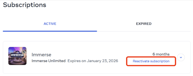 Se você efetuou uma assinatura IMMERSE no aplicativo de realidade virtual, deverá cancelá-la por meio da sua conta Meta pessoal, de uma das seguintes maneiras: