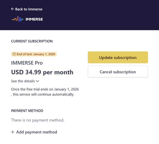 Clique em > Assinatura do aplicativo IMMERSE .