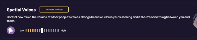 Se você estiver com dificuldade para ouvir as pessoas ou se as vozes parecerem muito baixas, recomendamos configurar o recurso Voz Espacial para Baixo . Isso limitará o efeito de atenuação do som causado pelo recurso e ajudará a garantir que você ouça as conversas com clareza.