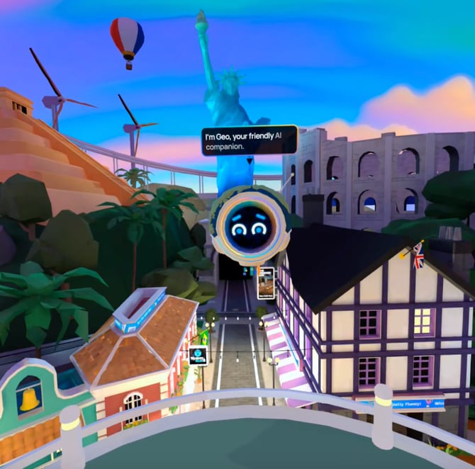 Você conseguirá ver um holograma dos menus do Geo de outros usuários (somente em RV) flutuando ao redor (veja a foto abaixo). Ocasionalmente, você poderá ouvir o Geo através do microfone deles, caso o dispositivo capte o som. Mas, fora isso, ninguém ouvirá o Geo diretamente da plataforma. Os usuários podem silenciar a si mesmos ou aos outros para evitar retornos de áudio.