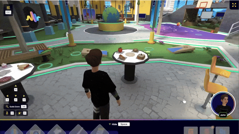 Para evitar sobrecarga e lentidão no servidor, selecionamos elementos específicos em cada cena que são frequentemente usados em aulas e eventos, permitindo que sejam agarrados e/ou escaneados. Atualizamos continuamente as cenas e os objetos interativos à medida que expandimos, com o objetivo de atualizar uma cena completa por mês. Esperamos que os avanços tecnológicos em breve nos permitam oferecer um ambiente ainda mais imersivo!